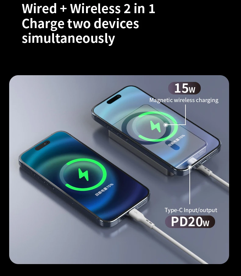 Features: 1 - 15W wireless power bank : Discharge and charge,automatically match 5W/10W/15W output without wiring ; PD20W fast charging by wire.